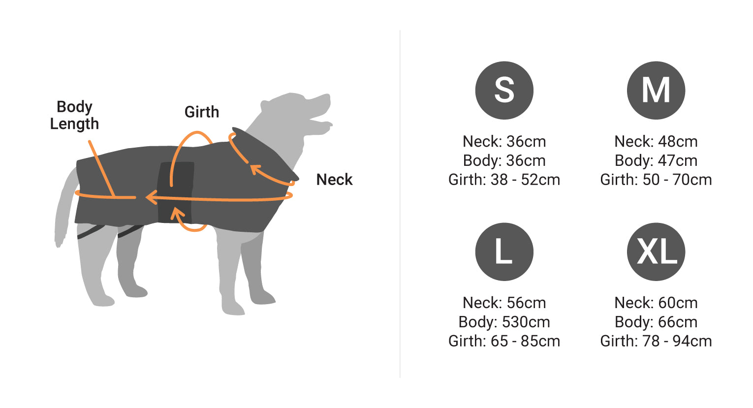 Neck - 360mm, Body length - 340mm, Girth - 460-600mm